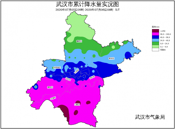 气象部门数据显示,5日8时至6日8时,本场雨水更“青睐”武汉南部地区,蔡甸区、武汉开发区、江夏区普降暴雨到大暴雨,局部还出现特大暴雨,而黄陂地区仅有小到中雨。其中江夏地区雨势最为迅猛,24小时内,江夏国家基本气象站累计雨量超过200毫米,位居全国降雨排行榜第二名,而乌龙泉自动气象站更是豪泼了435.4毫米(24小时内累计降雨量≥250毫米判定为特大暴雨),刷新武汉市有气象记录以来日降水量最大值,最猛的1小时降下88.3毫米,相当于1小时就完成了1天暴雨的量。