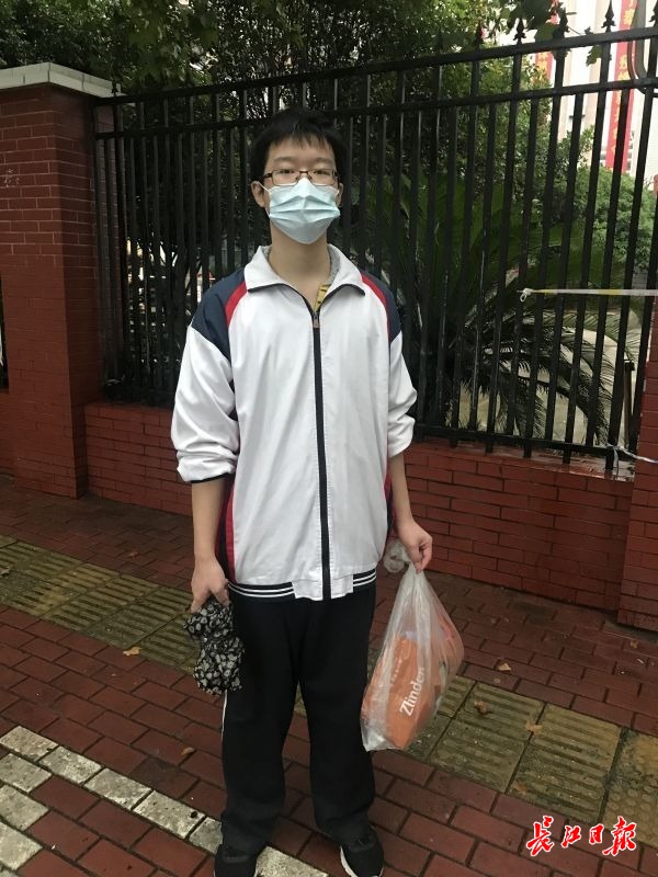 早上7点5分,江汉区刚下过一场阵雨,武汉市第十二中学考点候场区迎来了第一位考生。来自武汉市第六十八中学的男生胡畅,身穿校服,独自一人来到候考点。他告诉长江日报记者,今天早上6点就起床了,在家吃完早饭自己坐公交车到达考点。担心下雨,胡畅准备了替换的干净衣服和鞋子,神情从容淡定,他表示对接下来的考试有信心。