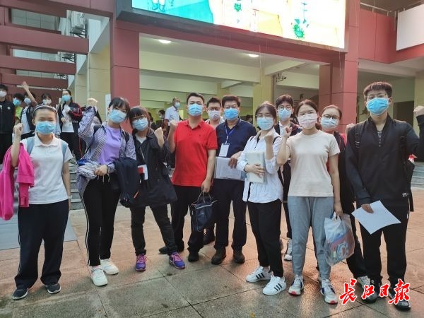 考点门口,学生们跟汤老师打出胜利的手势。记者向洁 摄