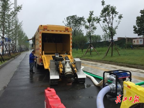 水务人员遥控“龙吸水”小坦克“爬”下抢险车。 记者万建辉 摄
