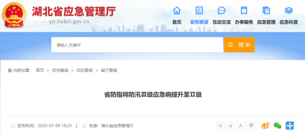 刚刚从湖北省应急管理厅获悉,湖北省防汛抗旱指挥部定于7月9日15时将防汛Ⅲ级应急响应提升为Ⅱ级应急响应。