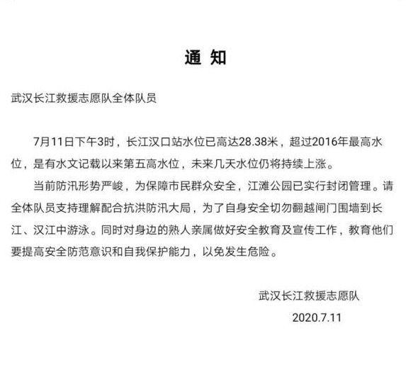 11日,长江救援志愿队发出倡议,希望各成员自我约束同时,尽量劝导他人不要到长江和汉江中涉险。