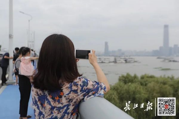 市民们在长江二桥上观看水情。记者杨涛 摄