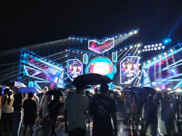 ◇ 11日晚,武汉欢乐谷电音节开幕,歌手和观众在雨中点“燃”武汉的夜晚。