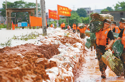 11日,武警战士在江西鄱阳县鄱阳镇江家岭村搬运抗洪物资。新华社记者 周密摄