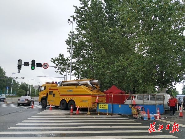 北靠封都山,南临南望山,八一路和阳光路交会口位于地势低洼处,暴雨天气容易汇水。为应对持续的梅雨天气,在易渍水点一侧,已有一辆每小时抽排量达3000立方米的“龙吸水”随时待命。