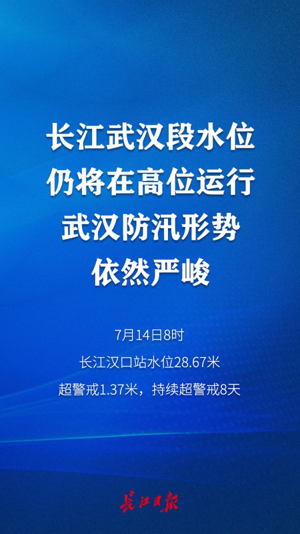上午8时,长江汉口站水位28.67米,超警戒1.37米,持续超警戒8天;汉江新沟站水位29.12米,超警戒1.62米,持续超警戒9天。