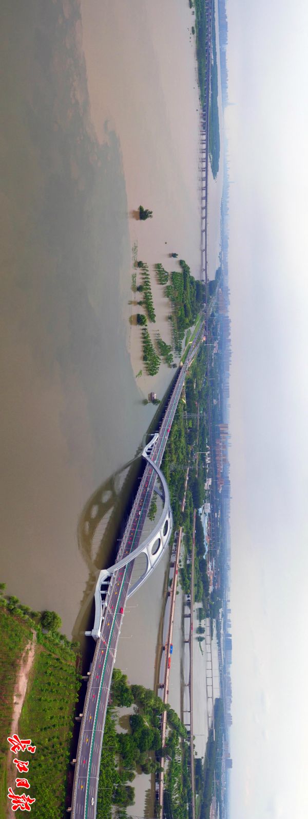 14日,从黄陂区武湖长江边望去,江面辽阔,江水已漫至江北快速路旁的防汛通道,行洪多日的天兴洲内一片泽国。