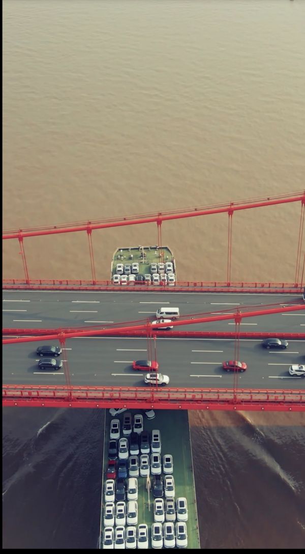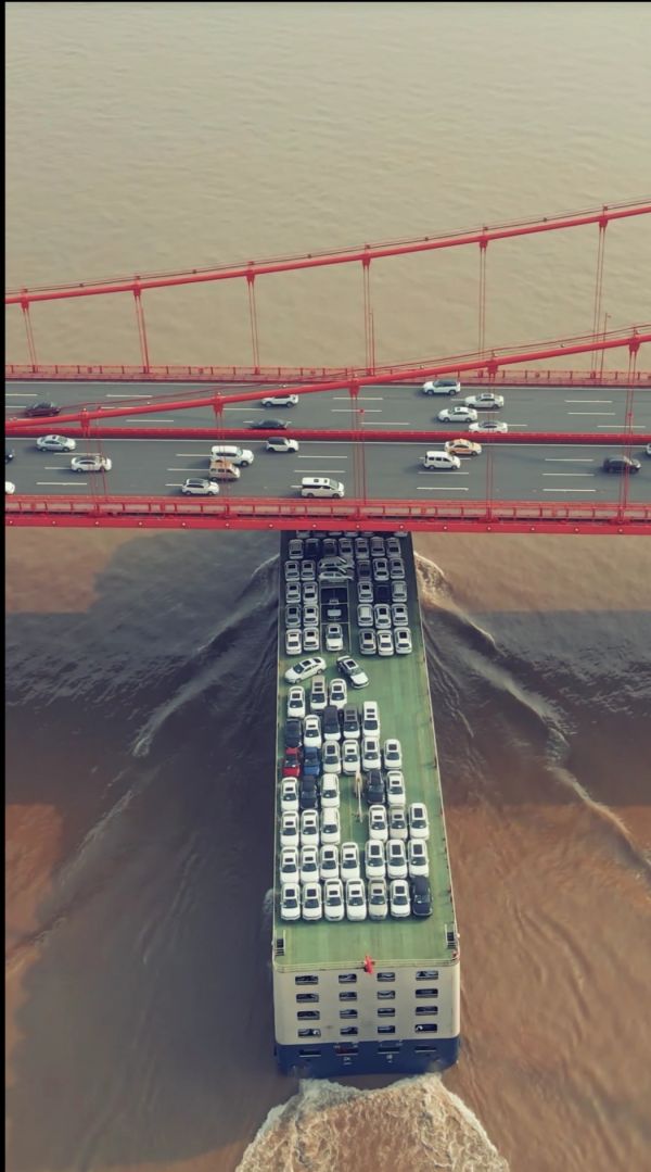 长江日报-长江网记者看到,“慧飞鸟”发布的视频中,一艘多层的货船顶部载满了小轿车,通过鹦鹉洲长江大桥时,桥上的车辆正常穿梭,货船则从桥下顺利通过。