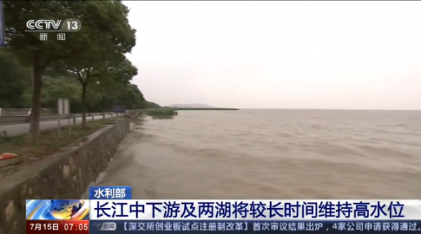 首先来看长江。水利部消息:截至昨天(7月14日)18点,长江中下游干流及洞庭湖、鄱阳湖水位超警0.12~2.76米。再来看太湖的情况。太湖平均水位4.44米,超警0.64米。