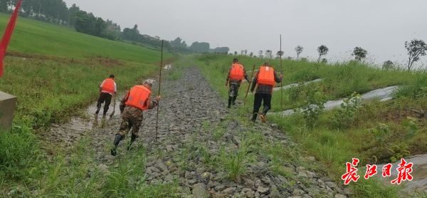 “仔细看有没有裂缝、散浸点?”在武湖大堤前川街孙教险段,排险固基、巡堤的干部两班倒,巡查频次也加密至每小时一次。每次3人一起走在斜坡坡度大约45度的堤上,1人在临河堤肩走,1人在堤半坡走,1人沿水边走,时而用竹竿检测堤坝是否有漏洞、裂缝,时而用耳朵探听浪击堤身的声音有无异常……行动规范,动作十分专业、娴熟。