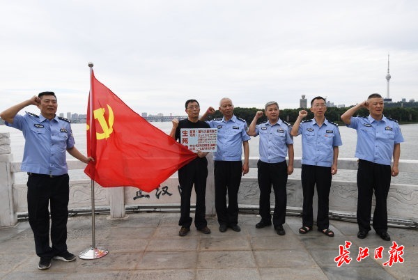 “誓与大堤共存亡!”22年前,16位抗洪英雄在龙王庙闸口签下“生死牌”,为护住一城安澜,誓与大堤共存亡。22年后,来自武汉市公安局江汉分局的6位抗洪英雄,再次来到龙王庙,面对长江举起右手再次宣誓。“守住堤就是守住家。”当年负责封堵闸口的江汉区水政监察大队李萍观察着江面,坚定地说,“请市民放心,我们有信心战胜洪水。”