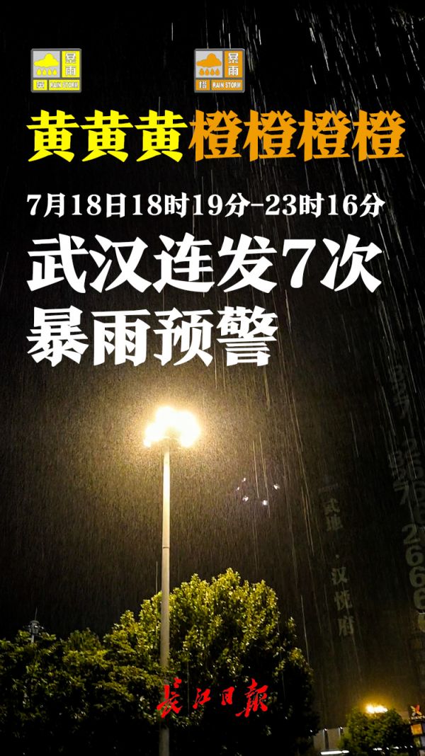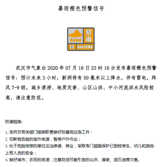 18日23时16分:武汉市气象台发布暴雨橙色预警信号:
