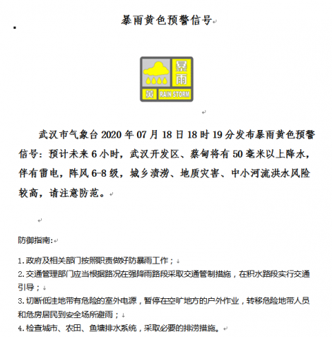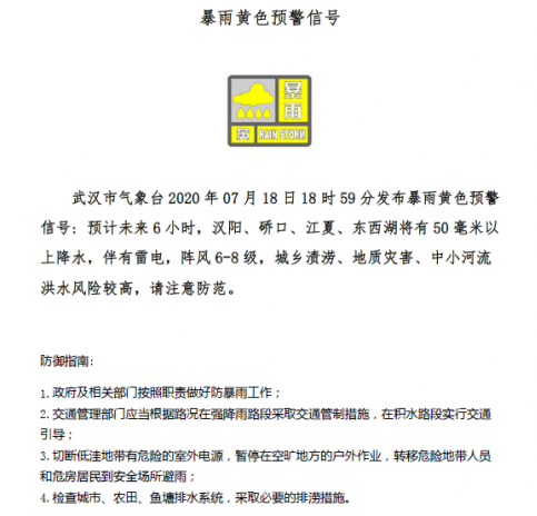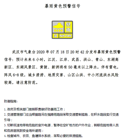 7月18日20时42分:武汉市气象台发布暴雨黄色预警信号:预计未来6小时,江汉、江岸、武昌、洪山、青山、东湖高新区、东湖风景区、黄陂、新洲将有50毫米以上降水,伴有雷电,阵风6-8级,城乡渍涝、地质灾害、山区山洪、中小河流洪水风险较高,请注意防范。