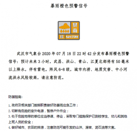18日22时42分:武汉市气象台发布暴雨橙色预警信号: