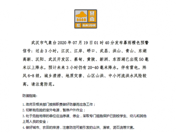 19日1时40分:武汉市气象台发布暴雨橙色预警信号:
