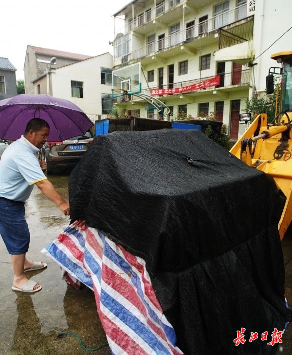 在长江村党群服务中心,一进门就可以看到两台黄色的铲车停靠在院内,在车库中,各种小型设备和生活用品放得满满当当。胡勇井的丈夫曹学习冒着大雨前来查看,他告诉记者这些都是提前转移出来的,“铲车、修草机等设备我们一共转移出来了十多台套,还有各种小型设备。”