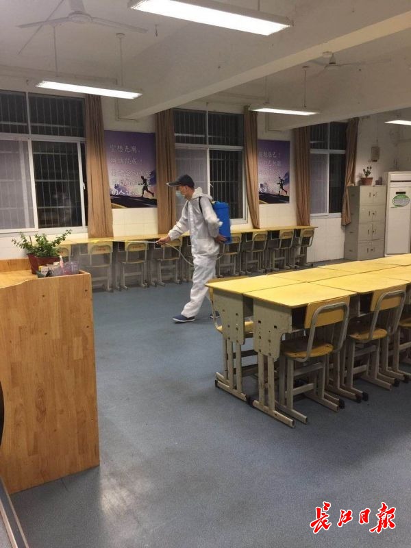 武汉市第十四中学考点的消杀、防疫准备工作。记者杨枫 通讯员李步敏 摄
