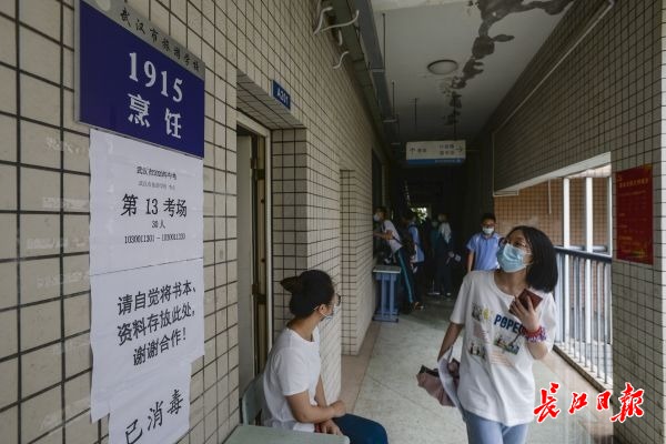 据介绍,武汉市旅游学校考点共设29个考场和3个备用考场,中考期间将有870名考生在此考试。考场楼下的展板上标示了考场平面图、考试时间表、注意事项等,考场入口处放置了免洗手液,考场每层楼都设有废弃口罩专用桶,考场门口贴着“已消毒”字样。记者看到,该考点的备用考场已布置好,内部桌椅摆放与普通考场一致,黑板上有“沉着 认真 细心 守纪”等提醒。蔡沁云说,按照要求,考点设了3个备用考场,今年的备用考场还将起到隔离的功能。如果有发热考生进入备用考场,则须坐在4个对角处的座位,一个备用隔离考场最多容纳4人。“学校今年也是高考的考点,中考的考务组织、防疫等方面的要求与高考是一致的,参与中考组织的教职工有120余人,也和此前高考时一样。”