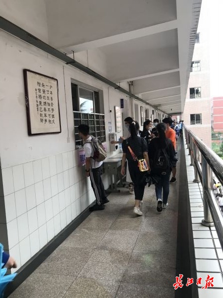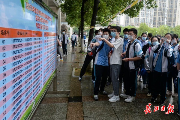 武汉市旅游学校考点,考生们查看自己考试的位置。记者 胡冬冬 摄