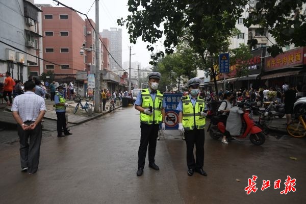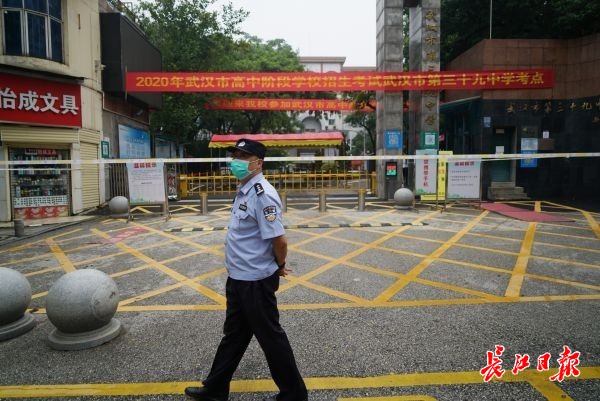 在汉阳区玫瑰街,汉阳区交通大队三中队民警在考场附近路口维持秩序。