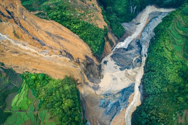 恩施州屯堡乡马者村山体滑坡形成的堰塞湖(无人机照片)。 新华社记者肖艺九 摄