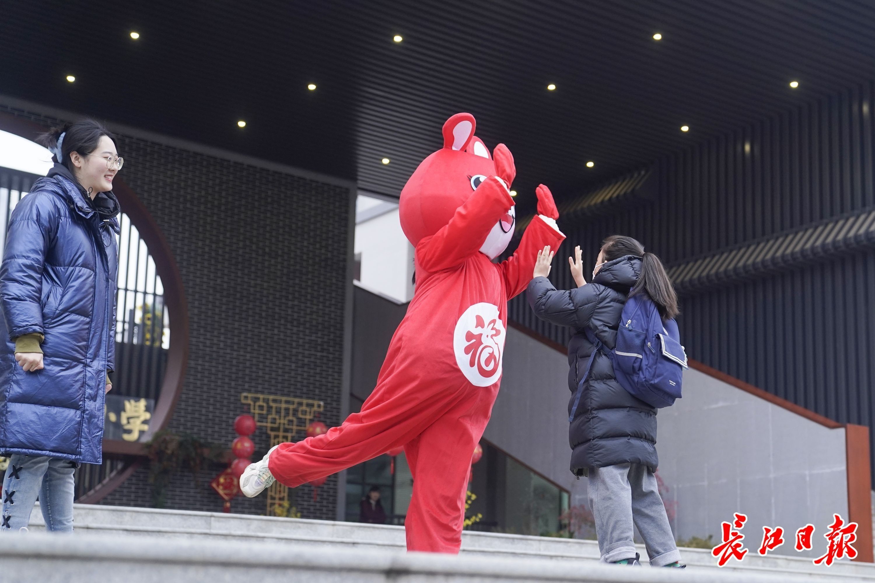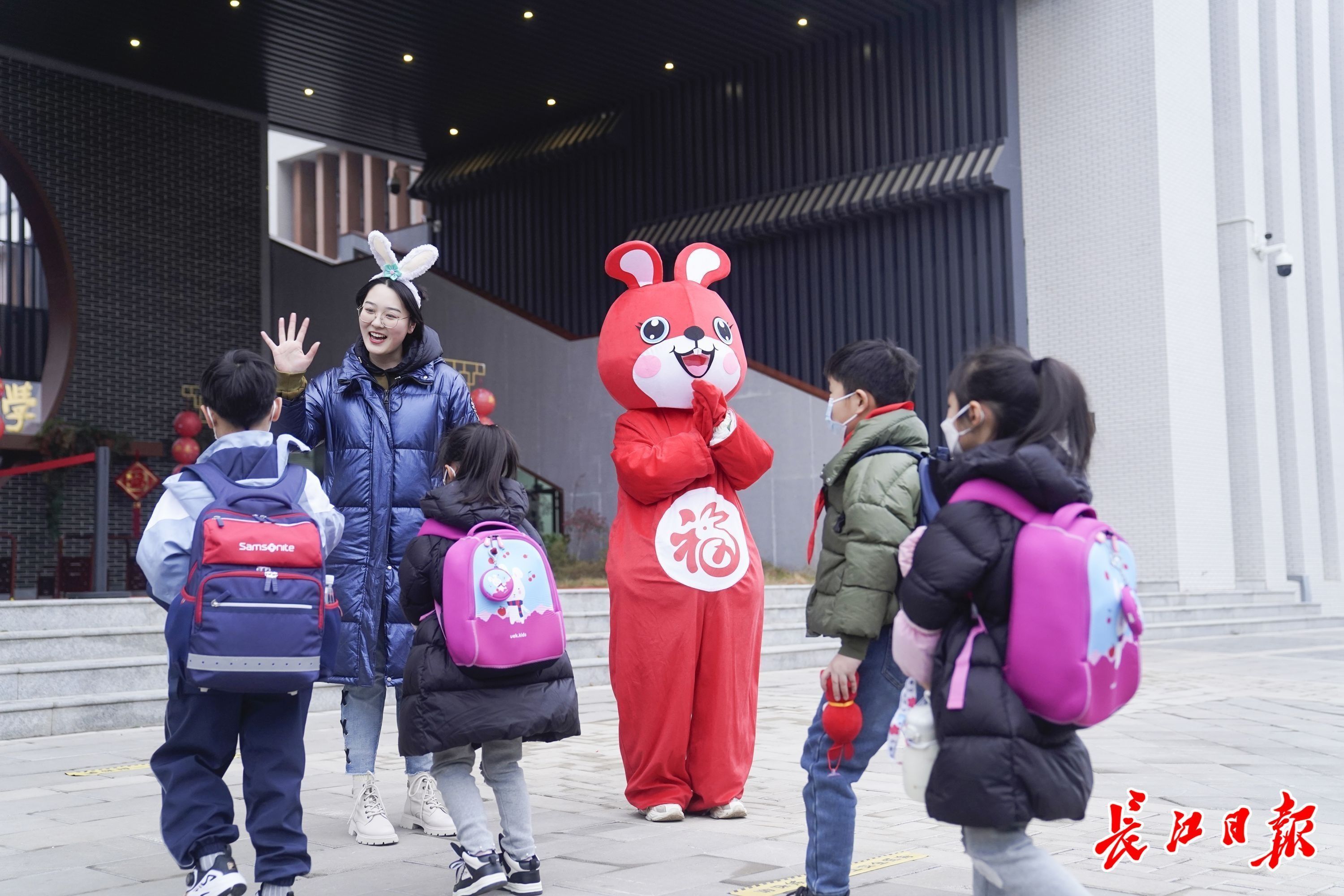 2月6日上午,武汉市3000余所中小学幼儿园,160余万学生春季开学啦!早上8时,汉口辅仁小学CBD校区的年轻老师们化身兔子玩偶,在校门口迎接孩子们回到校园。击掌、拥抱,小朋友开心地和兔子玩偶打招呼,在欢乐氛围中迈进新学期。