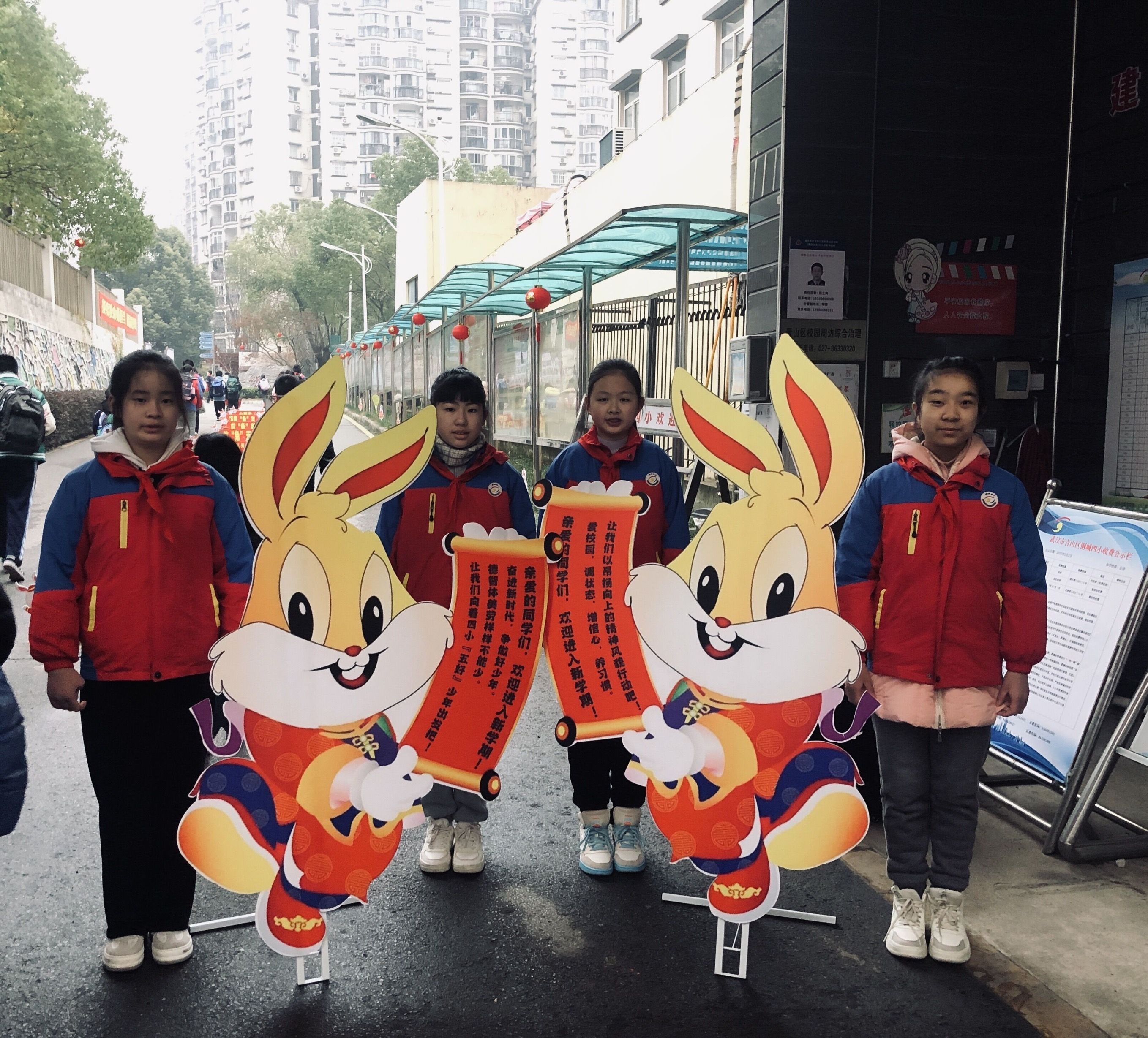 两只喜庆可爱的“兔子”站在大门两侧,欢迎孩子们回归。走进校门后,路边的花坛里、竹林中、绿树边,“小兔子”们带着祝福向师生招手。