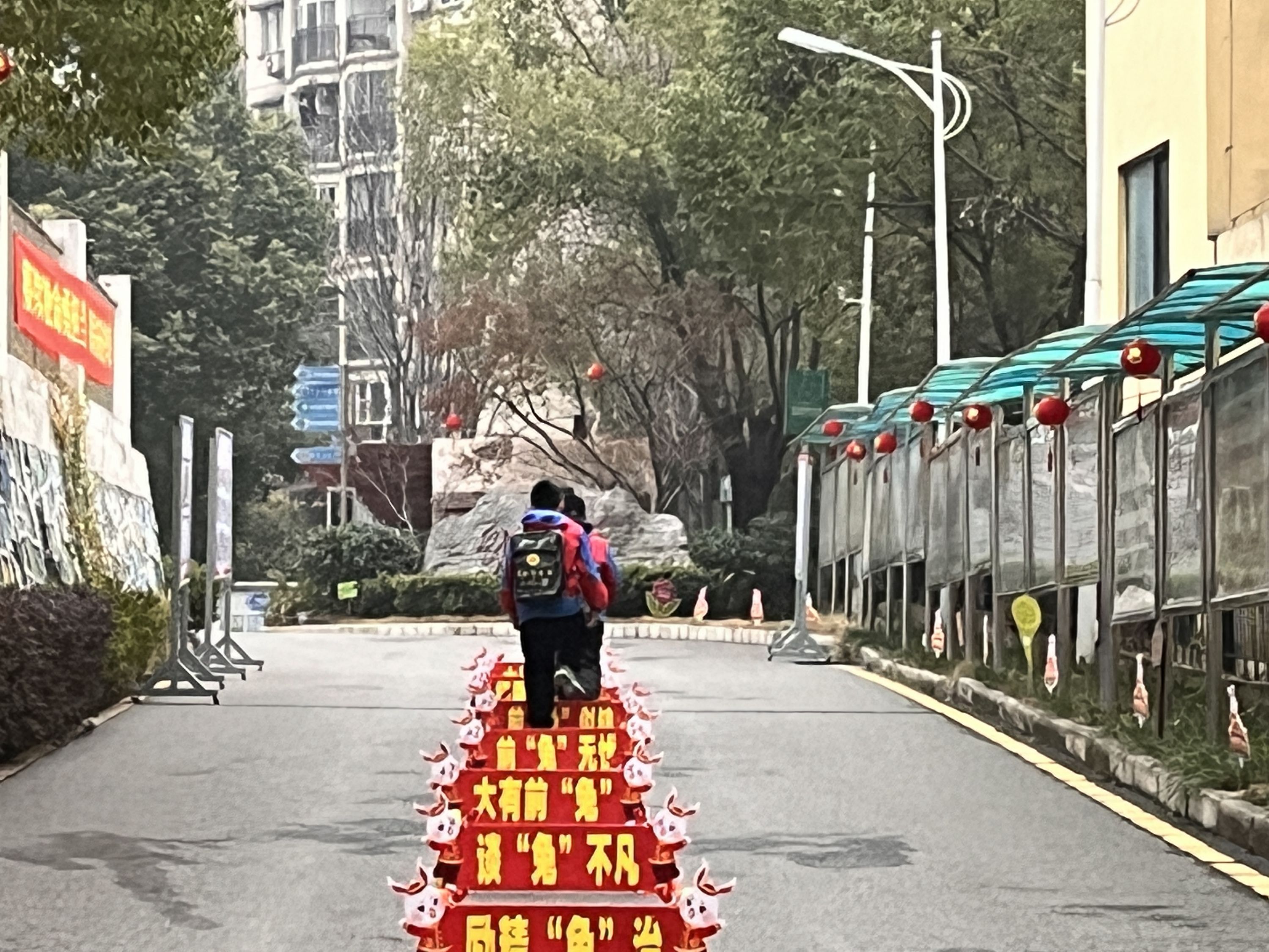 2月6日一大早,青山区钢城第四小学师生沿着兔年谐音成语组成的步步高阶梯,惊喜连连地走进教学楼。