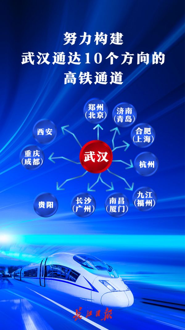 市委十三届九次全会提出,推进国铁、城铁、地铁“三铁融合”,建设“高铁上的武汉”。进一步推动沿江高铁、武西高铁、武贵高铁等建设,构建通达10个方向的高铁通道,加快构建“米”字形高速铁路网,把东西向打通、南北向畅通,进一步强化和提高交通枢纽功能,打造客运枢纽和物流中心。