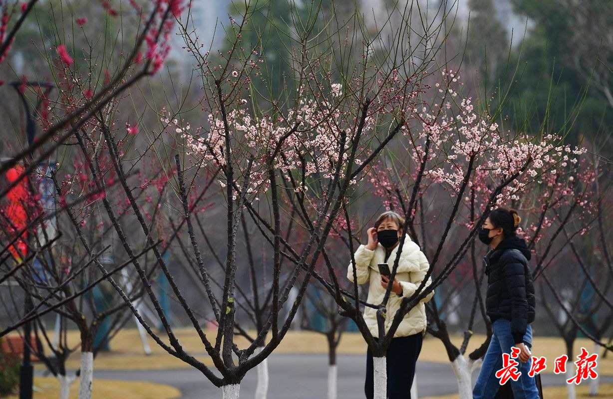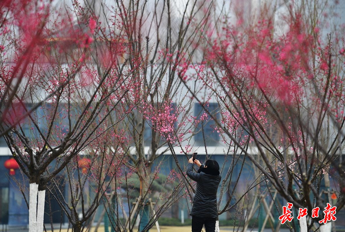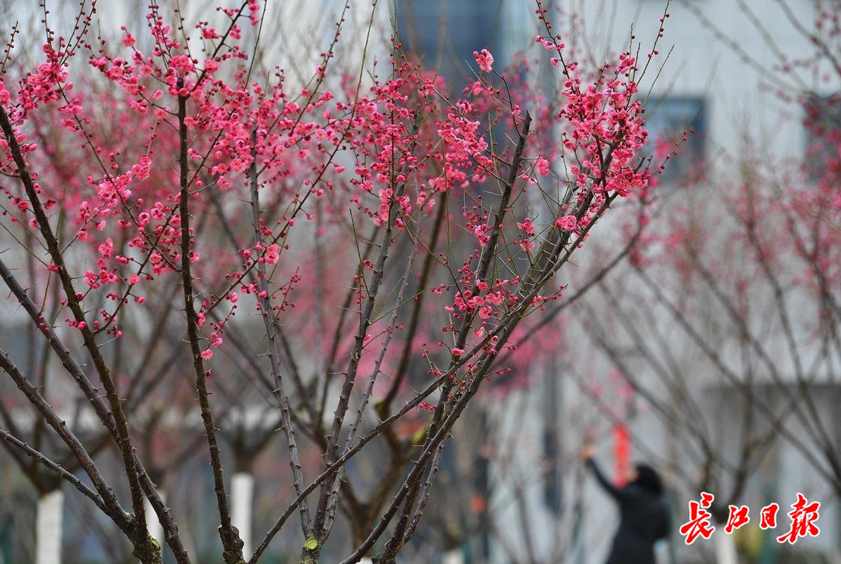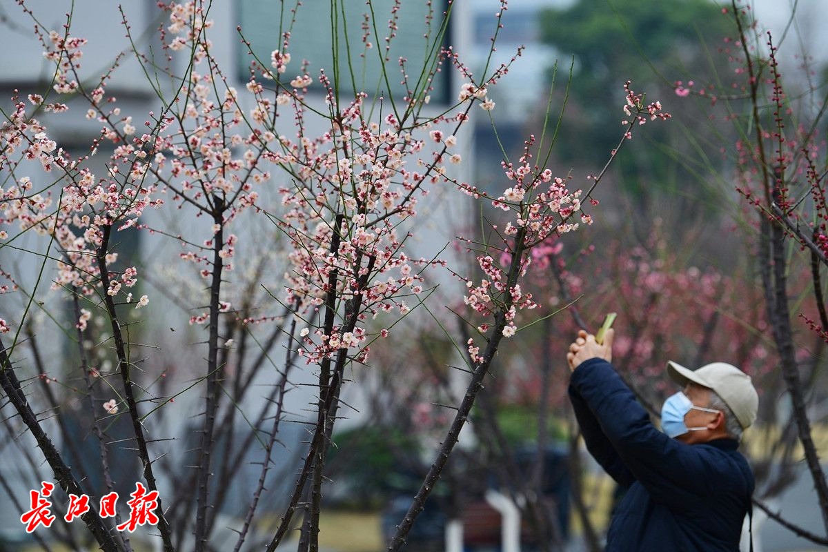 长江日报大武汉客户端2月6日讯 2月6日,武汉市常青公园梅园内,200余株梅花或红或白或粉的花朵挂在枝头,远远望去,梅色甚浓,走近细瞧,盛开的花朵却显得有些稀疏,仍是初花阶段。据了解,今年武汉梅花的盛花期比去年晚了大约一周,而且不同位置、不同梅树的花期每年也会前后摇摆。(长江日报记者李永刚 摄影报道)