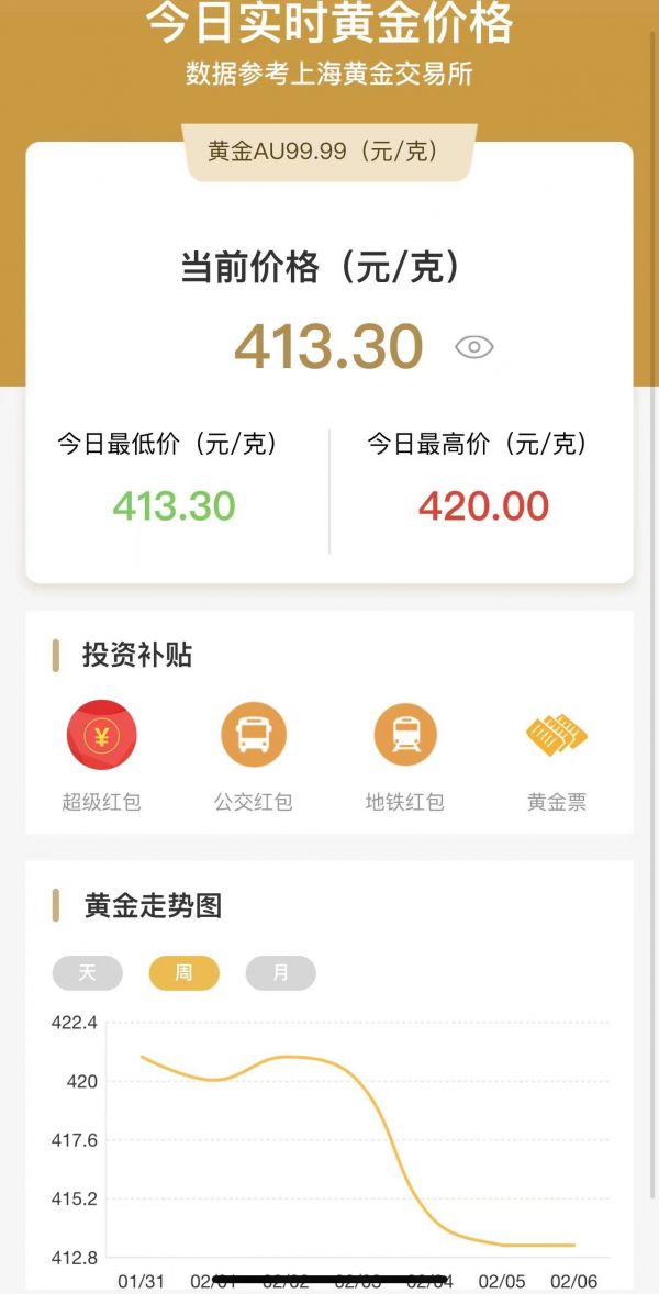 九派新闻查询后发现,今日每克黄金的实时价格为413.3元/克。从一周金价走势图来看,金价有小幅度下跌。近30天的价格波动中,过年期间金价走高,曾涨超422.4元/克。
