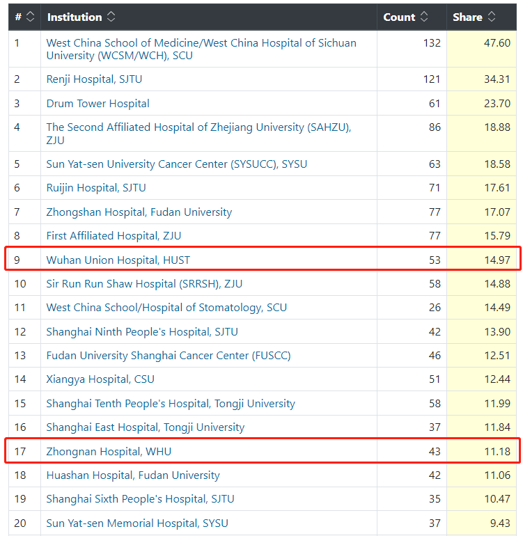 武汉地区入围全国医院TOP50的5家医疗机构分别为华中科技大学同济医学院附属协和医院(自然指数排名第9,论文数53),武汉大学中南医院(自然指数排名第17,论文数43),华中科技大学同济医学院附属同济医院(自然指数排名第23,论文数35),武汉大学人民医院(自然指数排名第32,论文数25),武汉大学口腔医院(自然指数排名第47,论文数10)。