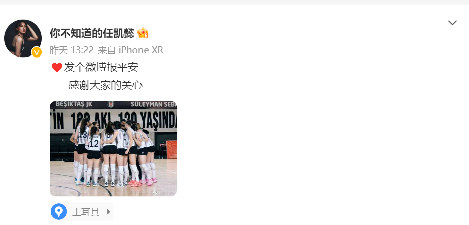 效力于伊斯坦布尔贝西克塔斯俱乐部的女排运动员任凯懿也向网友报了平安。