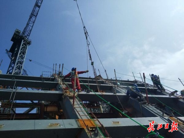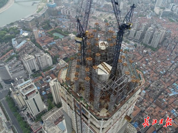 长江日报-长江网7月31日讯 7月31日,在武汉长江航运中心项目主塔楼的顶端,一座以“鸽子笼”为基本外形,临江一面形似“帽冠”的大跨度钢屋顶造型工程正式合拢,标志着武汉长江航运中心项目主体结构全部完工。
