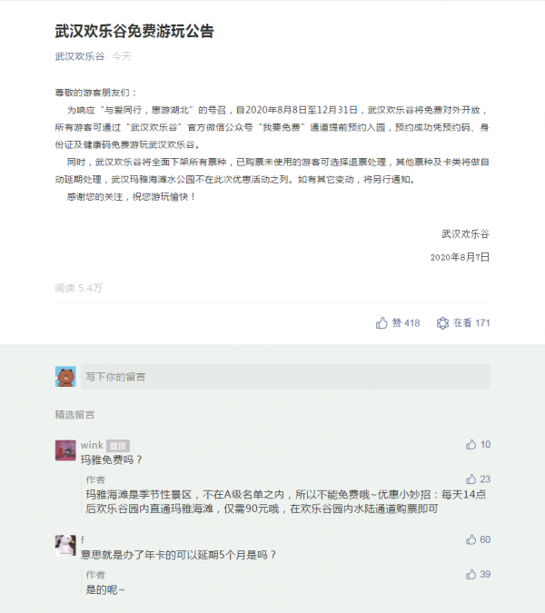 武汉欢乐谷的公告,表示年卡可以延期。记者杨荣峰截图