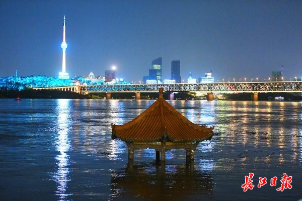 长江“水位标尺”武昌黄花矶凉亭,慢慢在江水中露出部分柱子。