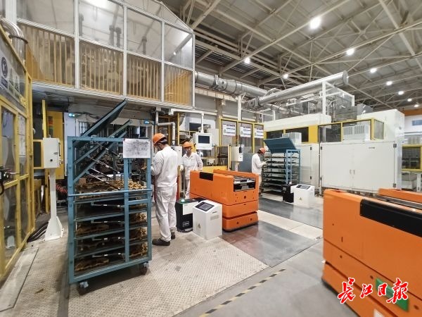 据悉,东本三厂是全球汽车标杆工厂。记者看到,这一发动机工厂高度自动化,铸造车间里基本看不到几个工人,只有一台又一台巨大的机器,AVG搬运小车顺着地面的磁迹和二维码来回移动,将原料、产品运送到需要的工位。