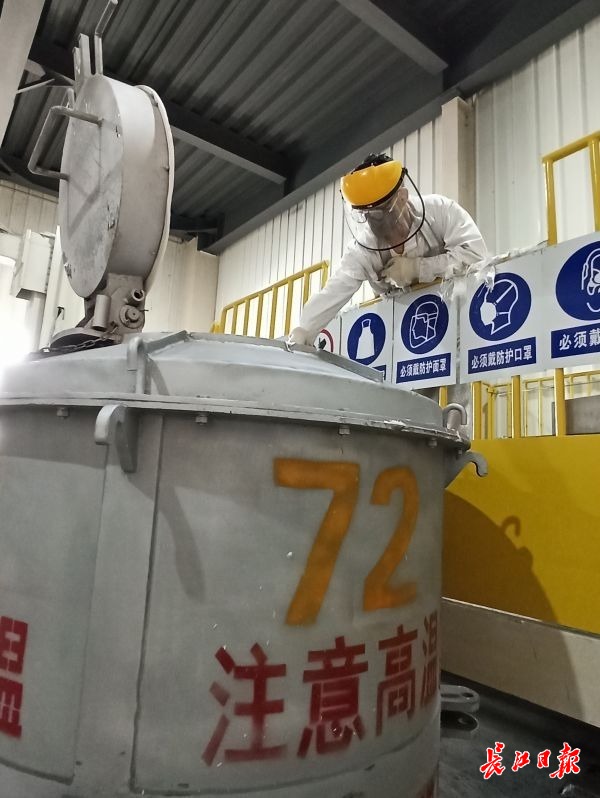 李劲头戴面罩,身披高温围裙,打开冒着热气的“壶”盖,站到高处,用一根长长的“勺子”,从“壶”中勺出铝液进行观察、操作。不一会,脸上便全是汗珠。