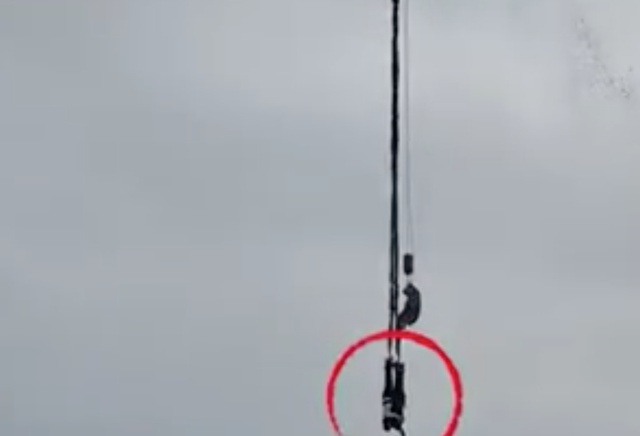 “蹦完极之后,工作人员要放扣环下去,游客拿到后自己扣上,才能被拉上来。结果他俩不愿意上来,就悬挂在空中。最后还是教练下去帮他们扣的。”
