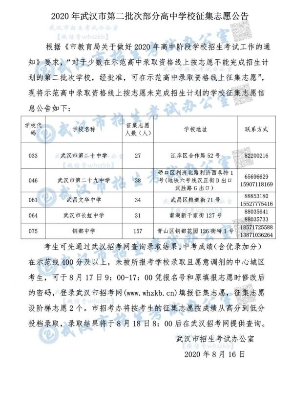 长江日报-长江网8月16日讯(记者刘嘉 通讯员邹永宁)8月16日,武汉市招考办发布第二批次部分高中学校征集志愿公告,武汉市第二十中学、武汉市第二十九中学、武昌文华中学、武汉市长虹中学、钢都中学这5所高中,征集志愿人数共287人。