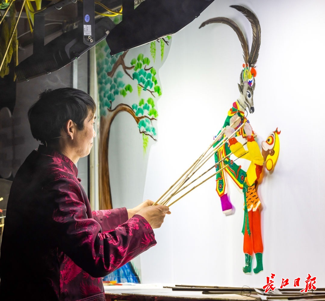 2月10日晚,是昙华剧场“好戏周周演”的首场演出。当天上演的剧目是非遗国粹皮影戏《猴王借扇》,场内几乎坐满。只见幕布上,活泼的猴子与铁扇公主、牛魔王斗智斗勇。观众屏气凝神,直盯着皮影的一举一动,时而被剧情逗得哈哈大笑,时而倒吸一口气。“哎呀,老牛变成梅花鹿了!”“妈妈,老牛的头会长出来呀?”剧场里小朋友被皮影戏的剧情吸引住,发出阵阵感慨与疑问。还有多位好奇宝宝不约而同直奔舞台后方,看孙悟空如何降服牛魔王。对此,表演者之一的陈红军非常高兴。“皮影做出来就是让人看的,不是躺在箱子里的”,陈红军是皮影戏非遗文化传承人,曾被联合国世界非物质文化遗产保护基金会评为“国际和平艺术家”。52岁的他,在学习制作和表演皮影戏方面已走过38年,制作了上千件皮影作品。每一件皮影都要经过绘画、雕刻、双面上色等多种工序,每一步都十分考验制作者的耐心。最让他骄傲的是,一件古风人物皮影在他的精雕细琢下,花了3000刀,历时半个月终于完美呈现。“角色需要时,她可以是貂蝉,也可以是王昭君,但是要避免观众产生审美疲劳,皮影还得要经常出新。”陈红军说。