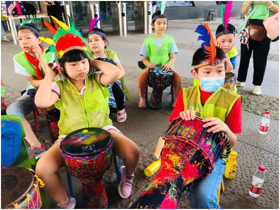 参加托管班的小朋友们体验神奇的非洲鼓。