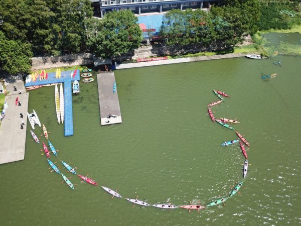在风光旖旎的东湖畔,孩子们进行皮划艇接龙。