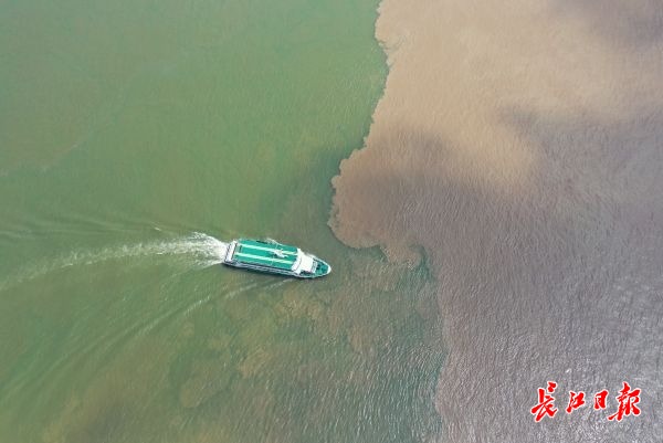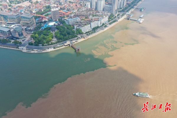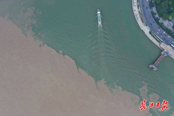 长江日报-长江网8月23日讯 武汉的南岸嘴是长江和汉江的交汇处,由于涨水,长江水含沙量较高,呈现浊黄色,而汉江的含沙量较少,显得碧波荡漾。2020年8月23日,记者通过无人机看到,两江交汇后在江面形成一绿一黄的纹理界线,两江口出现“泾渭分明”的水上景观。(记者彭年 摄影报道)
