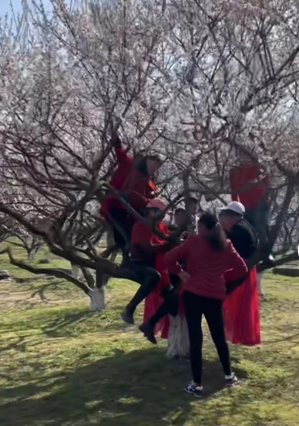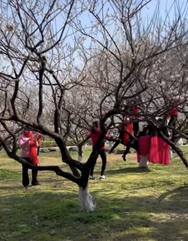 网传视频显示,在多株梅树竞相开花的超山风景区东园,天气晴好,数位身着红黑配色亮眼服饰的游客围绕着一棵梅树拍照。她们或倚靠树干、或直接坐在树枝上,一人负责在较远处为其拍合照。