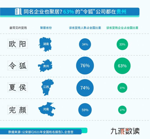 许多采用“复姓”来起名的企业,在聚居上和人口高度重合。根据企查查数据显示,目前全国企业名带“欧阳”的有3.8万家,其中湖南有1.2万家,占比32%;全国企业名带“令狐”的有3064家,其中贵州有1925家,占比超过75%;全国企业名带有“完颜”的有819家,来自河南有138家,占比16.8%,也是全国最多的。