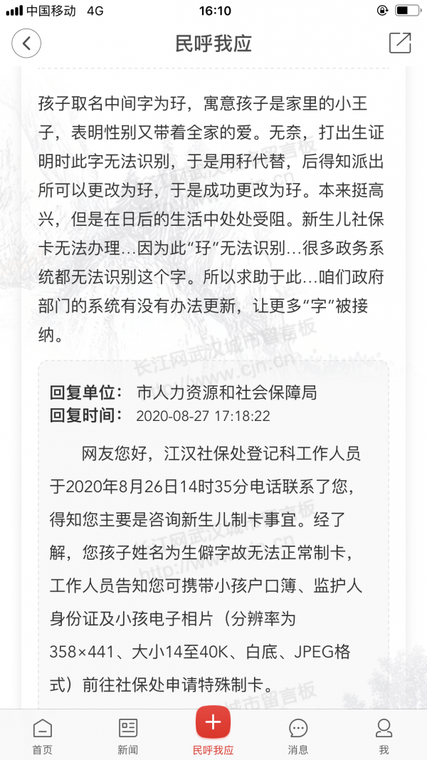 无奈之下,黄女士只得向长江网武汉城市留言板求助,江汉社保处表示,可以为其办理特殊制卡。