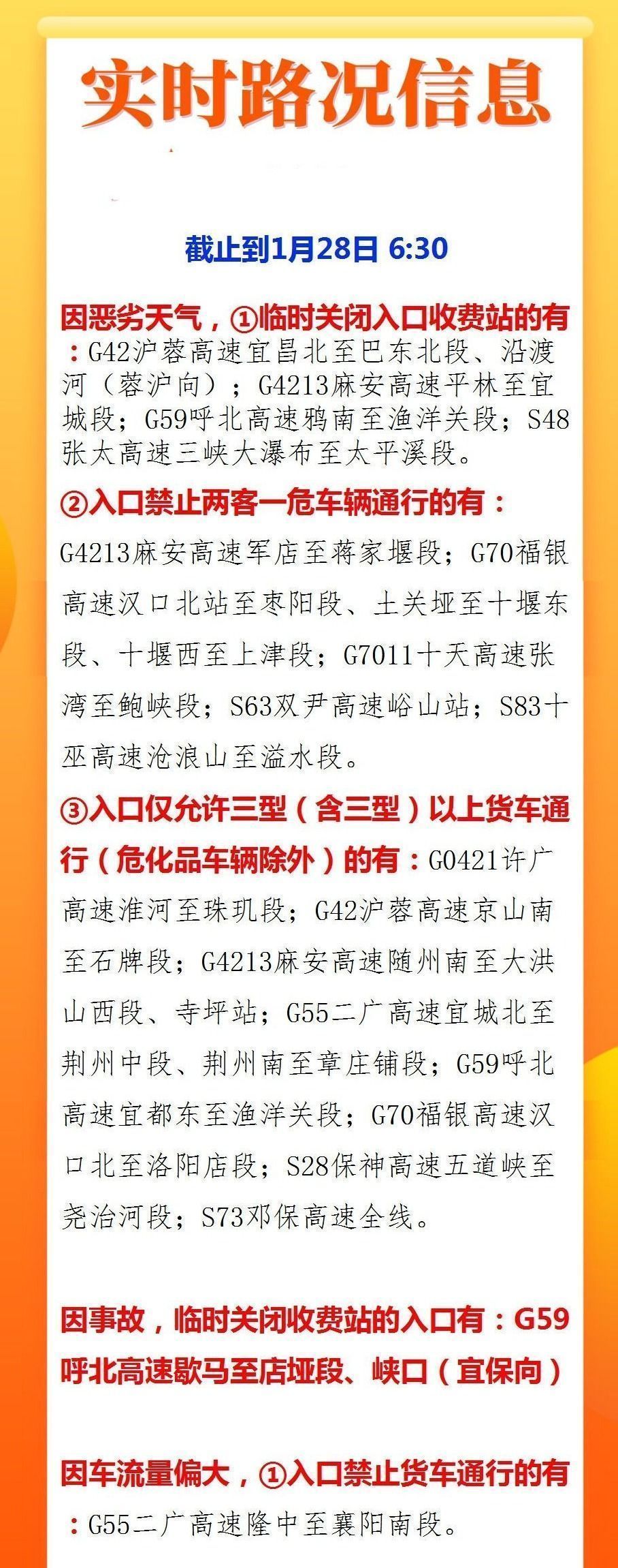 因恶劣天气,①入口仅允许三型(含三型)以上货车通行(危化品车辆除外)的有:G0421许广高速淮河至珠玑段;G4213麻安高速随州南至大洪山西段、保康至窑淮段;G59呼北高速歇马至峡口段、官山至房县段、王家畈至渔洋关段;G70福银高速随州至上津段;G7011十天高速张湾至黄龙段;S28保神高速全线;S53枣石高速吴店南至张金段;S73邓保高速全线;S83十巫高速沧浪山至溢水段。②入口禁止两客一危车辆通行的有:G0421许广高速陈场至朱河段;G4213麻安高速军店至蒋家堰段、长坪至保康段;S63双尹高速峪山站。③临时关闭入口收费站的有:G42沪蓉高速宜昌北至高岚段;G4213麻安高速平林至南漳段;G55二广高速黄集至十里段;G70福银高速汉口北至洛阳店段;S48张太高速三峡大瀑布至太平溪段;S53枣石高速石首北至石首东段;S88岳宜高速松滋西至石首段。
