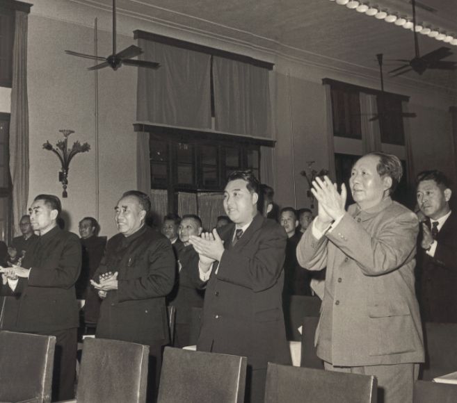 1958年11月25日,毛泽东在东湖宾馆会见金日成率领的朝鲜政府代表团。26日,设宴款待金日成一行后,毛泽东、金日成、朱德、周恩来等共同观看晚会。